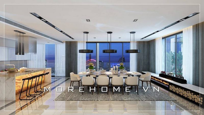 Bên cạnh đó, phong cách hiện đại thường chú trọng vào sự tối giản và chức năng, giúp phòng ăn trở nên gọn gàng và ngăn nắp hơn. Với thiết kế này, các yếu tố trang trí phức tạp được loại bỏ, nhường chỗ cho những chi tiết tinh tế và vật liệu tự nhiên. Kết quả là một không gian vừa sang trọng vừa gần gũi, nơi mỗi bữa ăn đều trở thành một trải nghiệm đáng nhớ. Không thể phủ nhận rằng việc thiết kế phòng ăn theo phong cách hiện đại không chỉ mang lại lợi ích về thẩm mỹ mà còn tạo ra môi trường lý tưởng cho những khoảnh khắc sum họp gia đình.